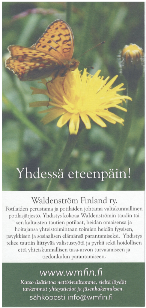 Esite on lyhyt yhteenveto Waldenström taudista antaen tietoa, että WM potilailla on oma yhdistys Suomessa, johon voi liittyä sekä potilaat, että potilaiden läheiset.